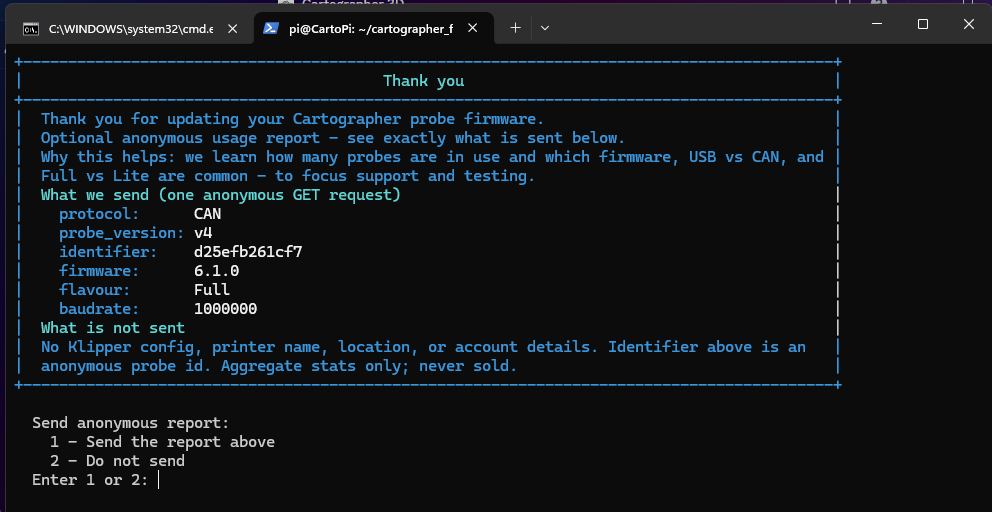 <figure><img src="https://docs.cartographer3d.com/~gitbook/image?url=https%3A%2F%2F3044346320-files.gitbook.io%2F%7E%2Ffiles%2Fv0%2Fb%2Fgitbook-x-prod.appspot.com%2Fo%2Fspaces%252FjpCp1KnR8izt0cnWQfZF%252Fuploads%252FDZn6JTnVsZ2PPPgG9gvj%252Fimage.png%3Falt%3Dmedia%26token%3D6d63fff9-ea16-4f8b-9a1f-a51905a3992f&#x26;width=768&#x26;dpr=4&#x26;quality=100&#x26;sign=7fbcbe29&#x26;sv=2" alt=""><figcaption><p>Firmwares Loaded</p></figcaption></figure>